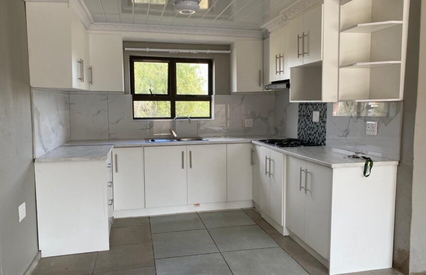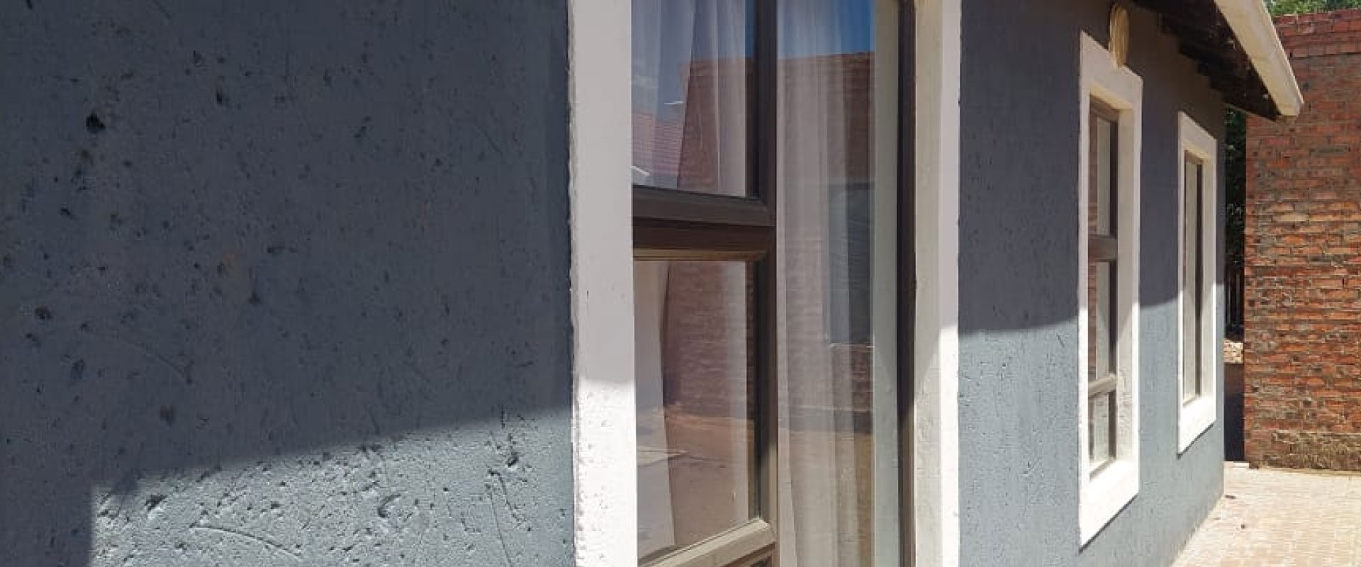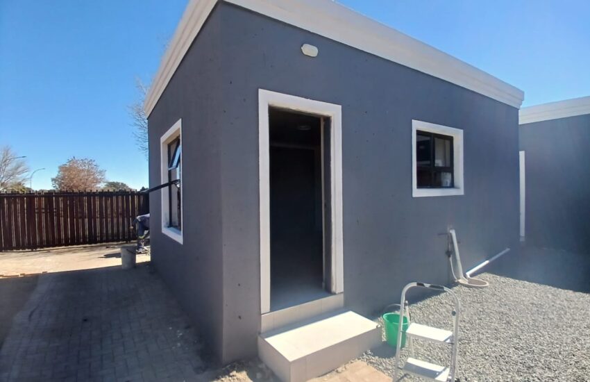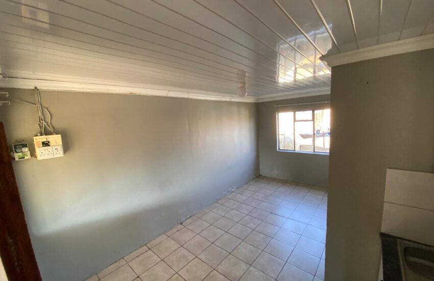 A one-bedroom apartment with a garden view. The ground-floor unit features a private entrance and a seating area.
